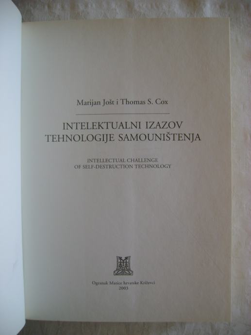 Marijan Jošt / Thomas Cox - Intelektualni izazov tehnologije samouništenja (GMO) - Intellectual Challange of Self-destruction Tehnology - izdavač Ogranak Matice hrvatske, Križevci 2003. godine, 17 x 24 cm, meki uvez sa preklopom, 308 stranica.