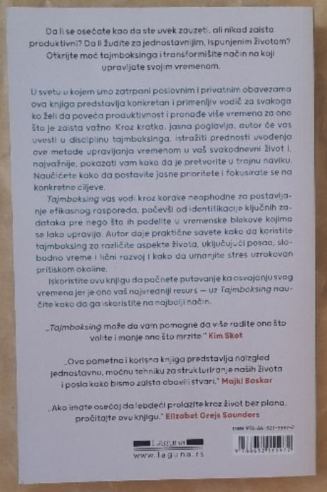Prodajem knjigu "Tajmboksing" autora Marka Zao-Sandersa. Radi se o stručnoj literaturi koja nudi praktičan pristup upravljanju vremenom i produktivnošću. Knjiga pokazuje kako organizirati dan i raditi jednu po jednu stvar, koristeći metodu tajmboksinga koja pomaže u postizanju boljih rezultata uz manje stresa.
