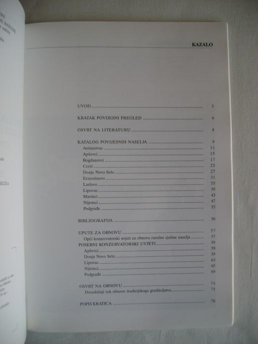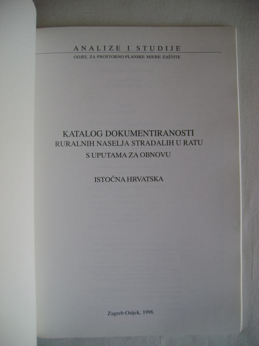Povijesna naselja - Istočna Slavonija; katalog dokumentiranosti ruralnih naselja stradalih u ratu, s uputama za obnovu - izdavač Ministarstvo kulture RH; Uprava za zaštitu kulturne i prirodne baštine, 21 x 30 cm, meki uvez, 76 stranica, ilustrirano, naklada 300 primjeraka.