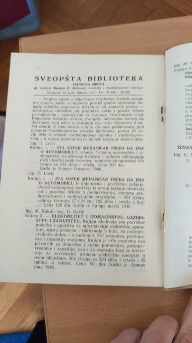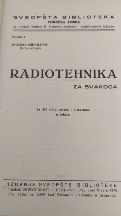 Prodajem, za ljubitelje elektronike, stručnu knjigu RADIOTEHNIKA ZA SVAKOGA autora inžinjera Božidara Mihailovića. Izdavač je SVEOPŠTA BIBLIOTEKA - Beograd, izdana 1946 god. Knjiga ima 301 stranicu, sa 280 slika, crteža i dijagrama u tekstu, a uvez je meki. Knjiga je zaista jako očuvana.