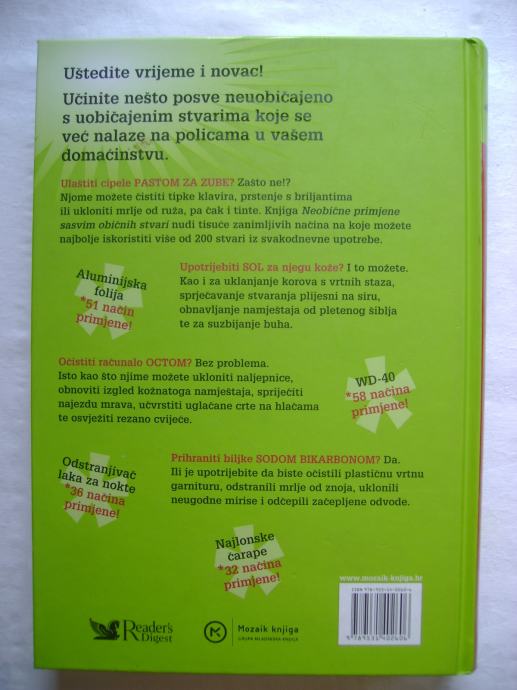 Reader's Digest - Neobične primjene sasvim običnih stvari - uredila Ivanka Borovac, izdavač Mozaik knjiga, Zagreb 2008. godine, 18 x 26 cm, tvrdi uvez, 407 stranica, bogato ilustrirano, tiskano na kvalitetnijem papiru.