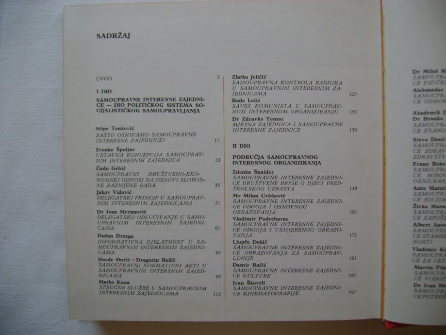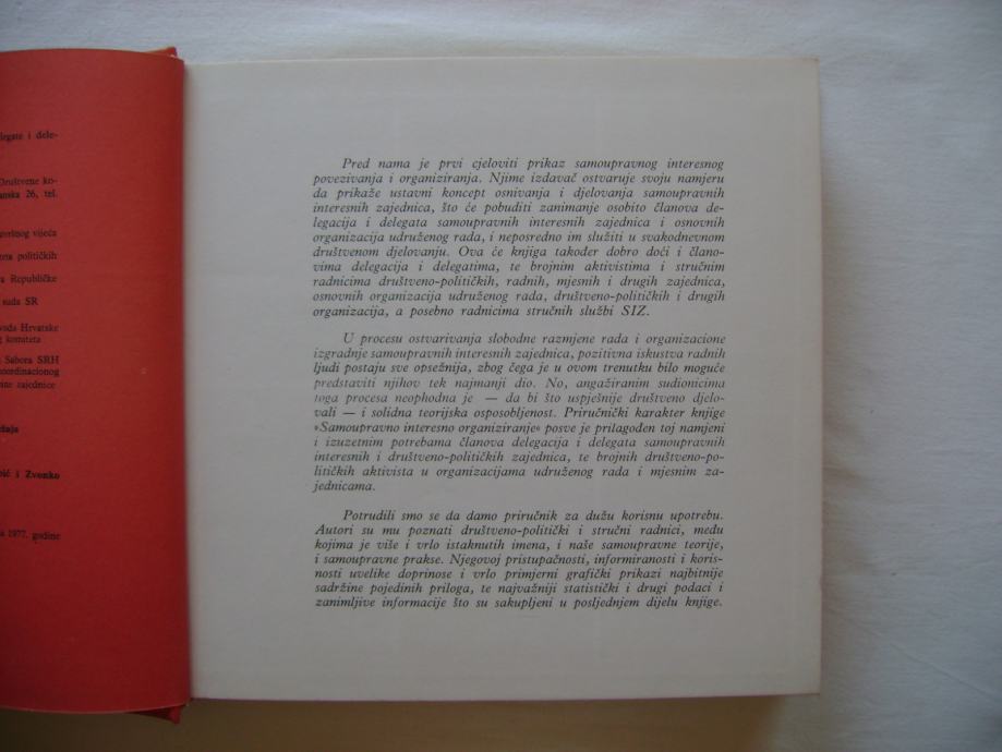 Samoupravno interesno organiziranje - Priručnik za delegate i delegacije u SIZ-ovima - glavni urednik Jakov Vidović, izdavač Grafički zavod Hrvatske, Zagreb 1977. godine, 21 x 20 cm, tvrdi uvez, 399 stranica, ilustrirano.