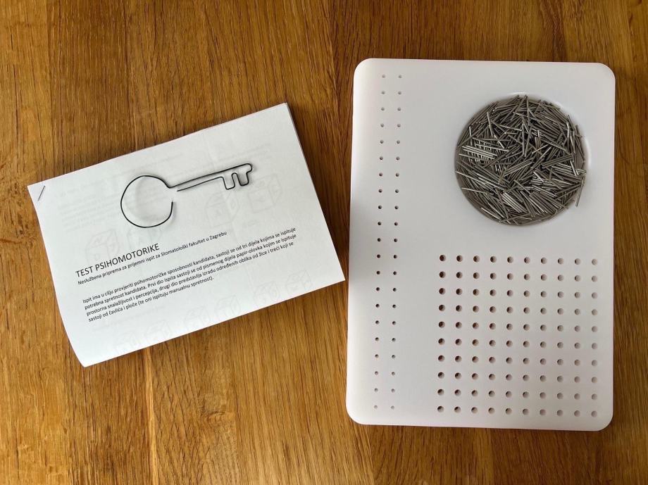 Prodajem o’Connorov test psihomotorike za prijemni ispit na stomatološkom fakultetu u Zagrebu i Osijeku. Uz deksterimetar i žice dolazi i skripta s objašnjenjima za prijemni ispit. Čavlići su originalni, a dimenzije ploče su kao sa ispita koji se provodi.