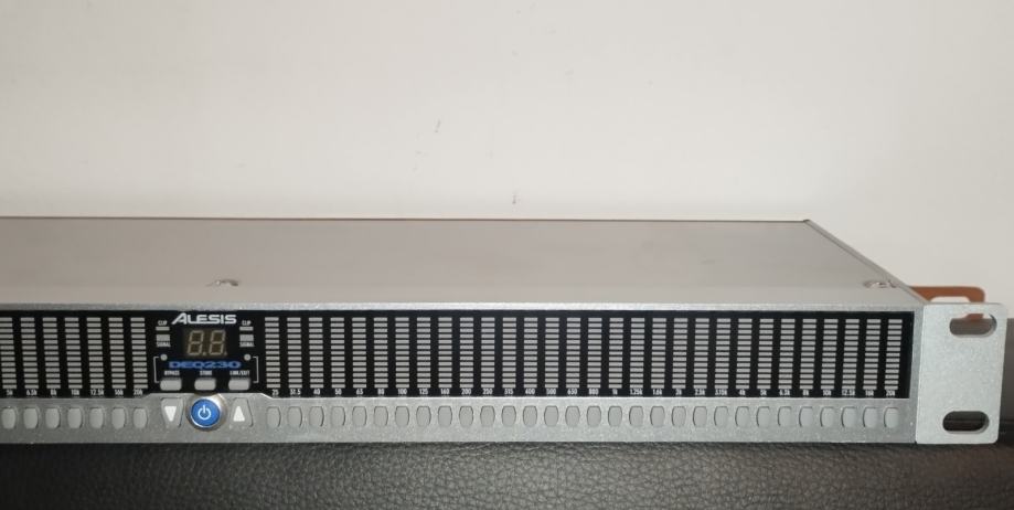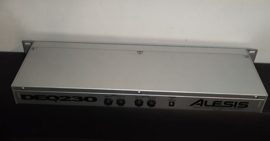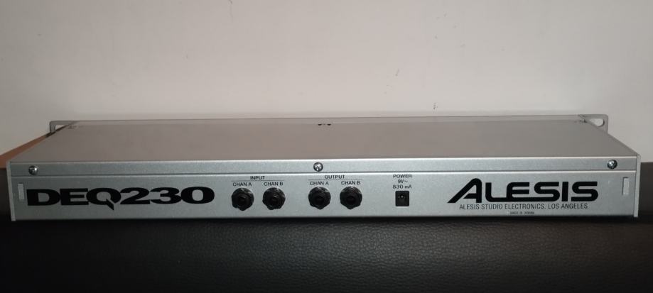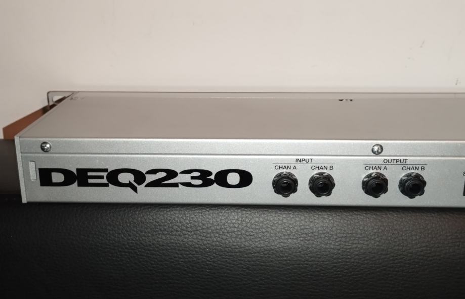Analog: 2 inputs, 2 outputs (1/4″ TRS; –10dBV/+4dBu on 230D, –10dBV on 230). Digital on DEQ230D: S/PDIF coaxial (RCA) in, out. Other on DEQ230D: MIDI in, out.