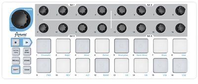 In SEQ mode, your pads become enables for each step in your sequence. The 16 encoders will adjust pitch for the associated step. 16 memories allow for instant recall of your favorite patterns while the pad scale modes, seq playback modes and time division functions allow for real-time performance changes.