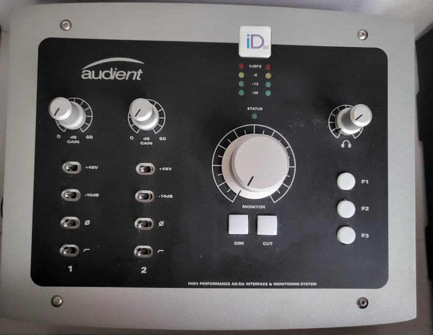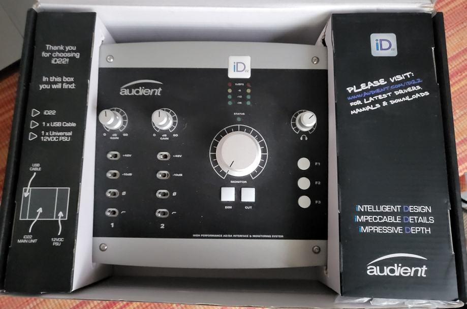 Ko novo, sva dodatna oprema. iD22 pruža zvučne performanse konzole velikog formata u kompaktnom i elegantnom desktop paketu. Pružajući par Audientovih konzolnih mikrofona, vodeće tehnologije pretvarača Burr Brown, kontrole monitora konzole, JFET DI, proširivosti ADAT-a, korisnički definiranih funkcijskih tipki, uravnoteženih umetaka i više, iD22 će postati središte vašeg studija ni u kojem trenutku. 10-in, 14-radno sučelje za stolna računala, 2 x klasa-A, pre-pojačala za Audient Console, visokokvalitetni pretvarači Burr Brown AD / DA, potpuno uravnoteženi ulošci, ADAT ulaz za proširivost, 1 x diskretni JFET instrument Input, Glavni i alternativni zvučnički izlazi, neovisni izlaz za slušalice klase A, korisnički definirani funkcijski ključevi, funkcionalnost kontrole cijelog zaslona (kontrolirano softverom), usklađen s USB 2.0 standardom. Dimenzije: 225 x 180 x 60 mm. Težina: 1,5 kg.