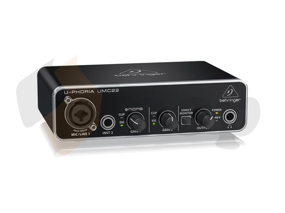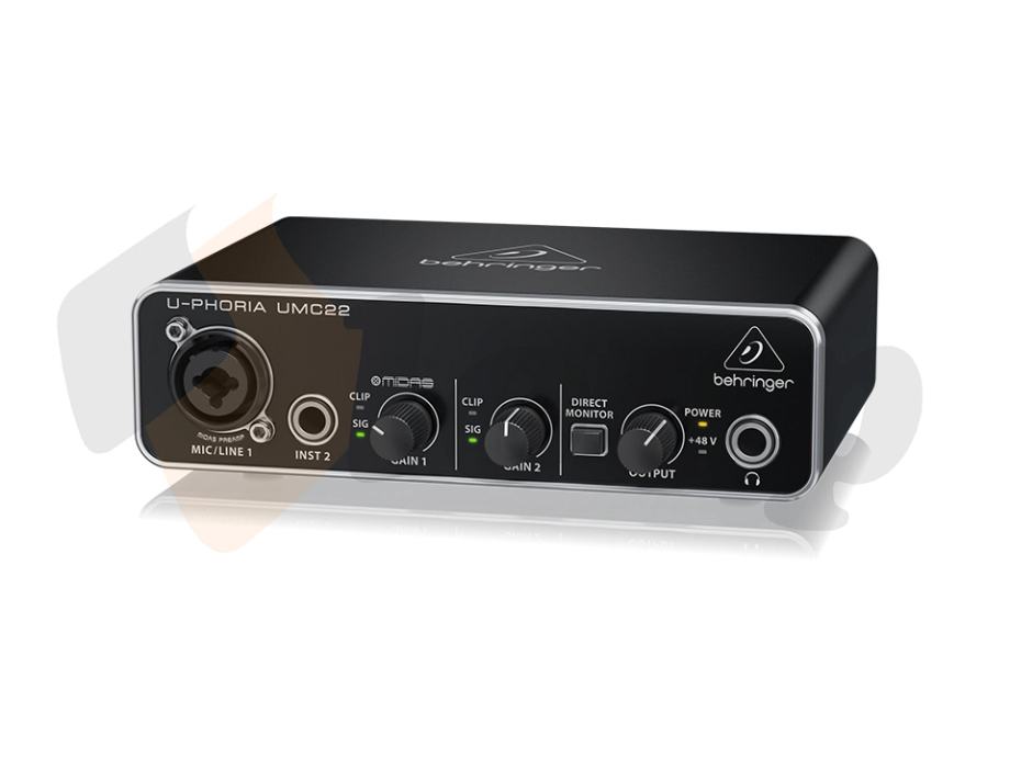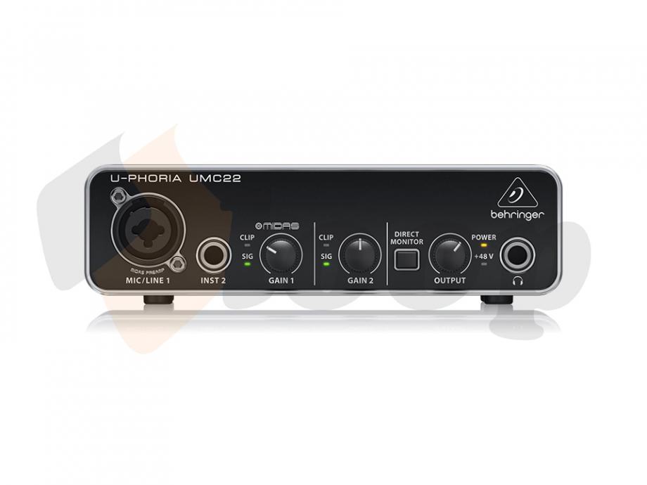 2-Channel USB Audio Interface; 16 Bit / 48 kHz, 2 Inputs and 2 outputs, 1 Combi jack XLR / 6.3 mm jack and 1x 6.3 mm jack; MIDAS-designed microphone preamp with 48 V phantom power; Guitar input; Signal and clip display; Direct monitoring with level control; Headphone output: 6.3 mm jack; 6.3 mm jack output; USB Bus powered; Metal housing; Compatible with Windows XP, Vista, 7-10 and Mac OS; Includes USB cable.