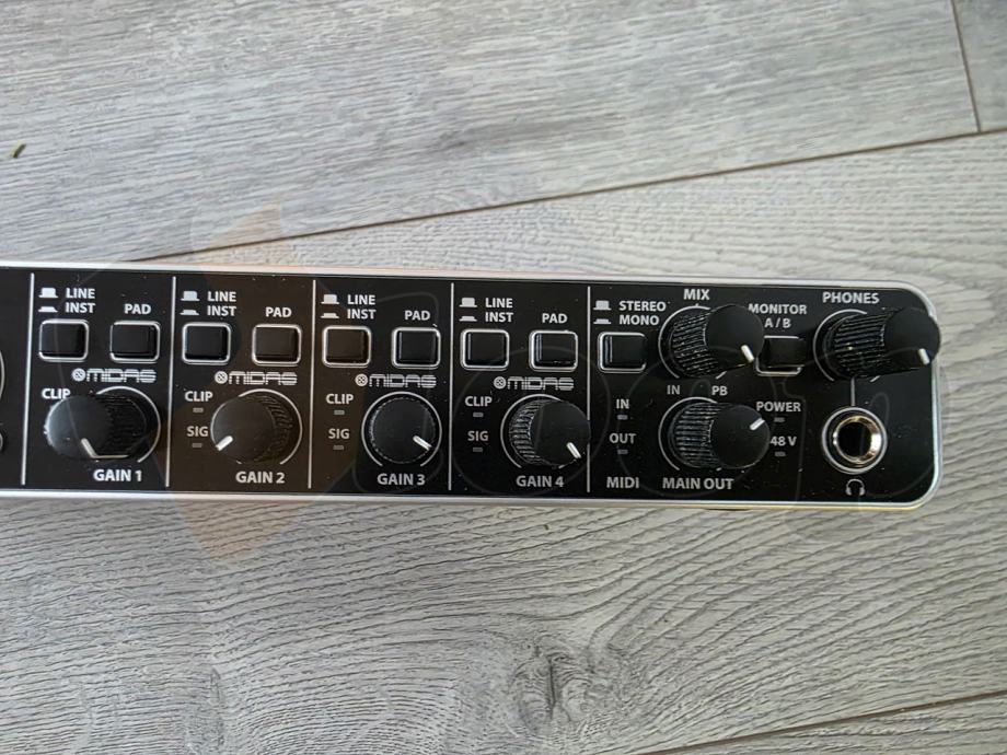 Audio MIDI interface 4×4 USB 2.0 s MIDAS mikrofonskim predpojačalima. Nudi odličan odnos kvalitete u odnosu na cijenu. 24 bits; 192 kHz; 4 Inputs and 4 outputs; x XLR/jack 6.3 mm Combo Mic/Line input with Pad switch and Clip/Signal LED; 4x Line output jack 6.3 mm/RCA (2x L/R); Main output XLR/jack; 4x Insert 6.3 mm jacks; MIDI in/out; Switchable phantom power 48 V (for channel 1-4); Stereo headphone-output 6.3 mm jack; USB port; Power supply connector; Zero-Latency Direct Monitoring...
