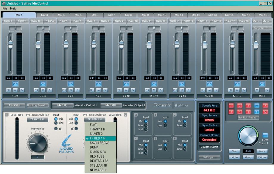 Saffire Pro MIXER Control Software with custom output mix control and 24-bit, 192kHz integrated A-D/D-A