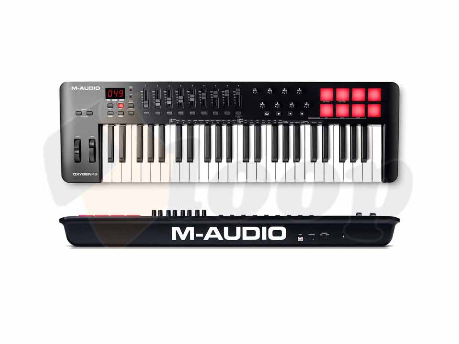 M-Audio Oxygen 49 MK5; USB MIDI controller keyboard with 49 velocity-sensitive keys; 8 velocity-sensitive trigger pads with note repeat function; 8 assignable knobs; preset and DAW buttons for automatically assigned instruments and plug-ins; 9 assignable fader for plug-in parameter control; Smart Chord & Smart Scale mode; Arpeggiator with control for type, octave, gate and swing; transport buttons for DAW control; LCD display; pitch bend and modulation wheels; sustain pedal input; USB 2.0 (bus-powered); included software package: Ableton Live Lite, MPC Beats, 2 virtual instruments from AIR Music Technology (Hybrid, Mini Grand), 5 MPC Beats Expansion Packs and MIDI Editor software; scope of delivery: USB cable, software download card and quickstart guide; dimensions (W x D x H): 814 x 243 x 94mm; weight: 2.9kg