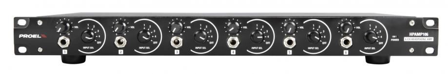 PROEL HPAMP106 pojačalo za slušalice. Pojačala za slušalice dizajnirana za nadopunu audio sustava u primjenama na pozornici, studijima za snimanje i fiksnim instalacijama. Smješteni u elegantnom aluminijskom kućištu sa 6x nezavisnih sekcija pojačala velike snage prikladnih za sve vrste slušalica, 4x izborna glavna stereo/mono ulaza s ¼” JACK konektorima (STRAŽNJA ploča), 6x stereo izlaza za slušalice s pojedinačnim kontrolama razine, 300mW maksimalne izlazne razine na 32 ohma (po kanalu), ugrađenim napajanjem s toroidnim transformatorom i selektorom napona.