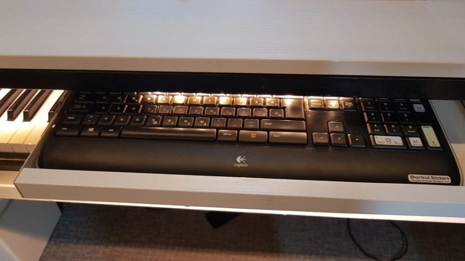 Glavni stol željezne konstrukcije, dimenzija W×D×H 1630×950×800 s osvijetljenom aluminijskom ladicom za > 88 tipki klavijaturu visine do 110 mm. i osvijetljenom ladicom za tipkovnicu.