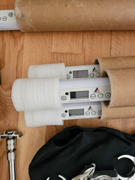 Prodajem u kompletu Asteru Titan i 3 Helios tube, Dop choice softbox za 3 helios tube, 2 punjača, 4 stalka i kukice za montažu.