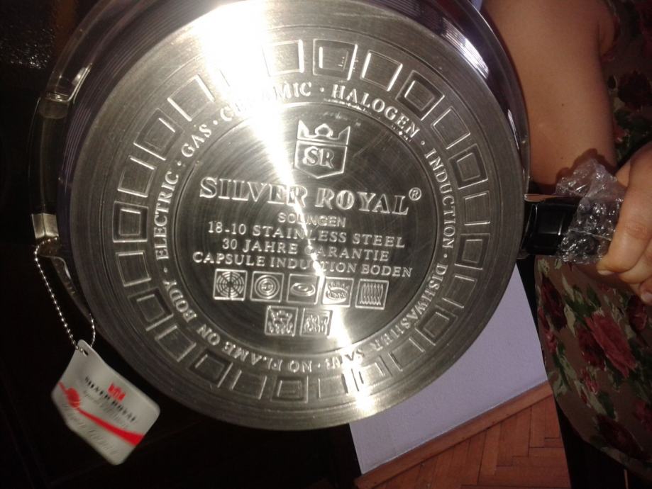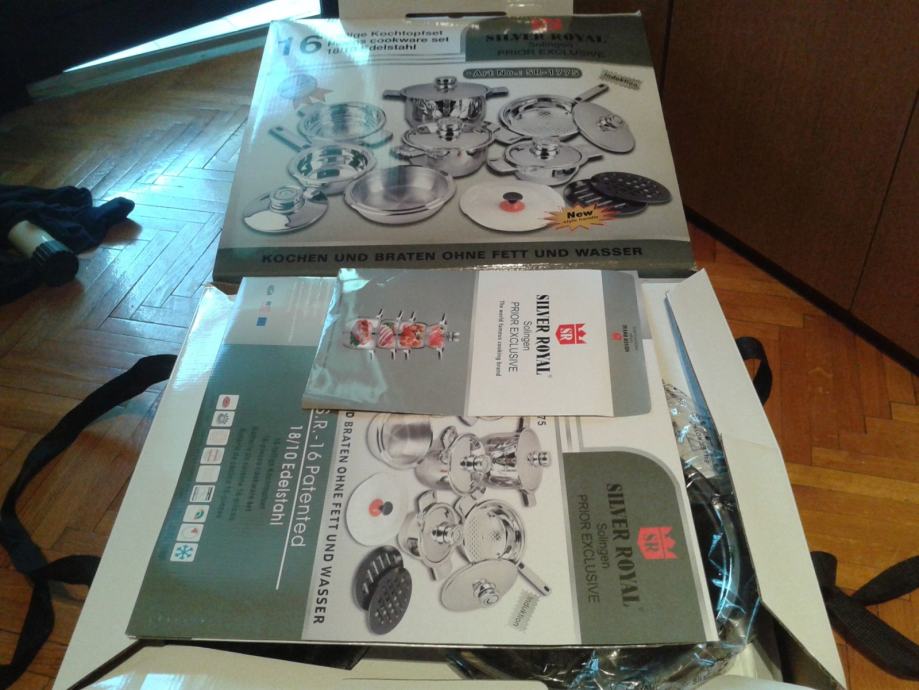 SILVER ROYAL Solingen - PRIOR EXCLUSIVE posuđe. Proizvedeno je za zemlje EU.U kompletu je 16 komada i garancija 30 godina. Potpuno NOVO (nekorišteno). Vrlo kvalitetno posuđe; slojevito izrađeno dno sa 9 elemenata, termostatski poklopci s kontrolom topline i pare, kuhanje bez masnoća i vode.