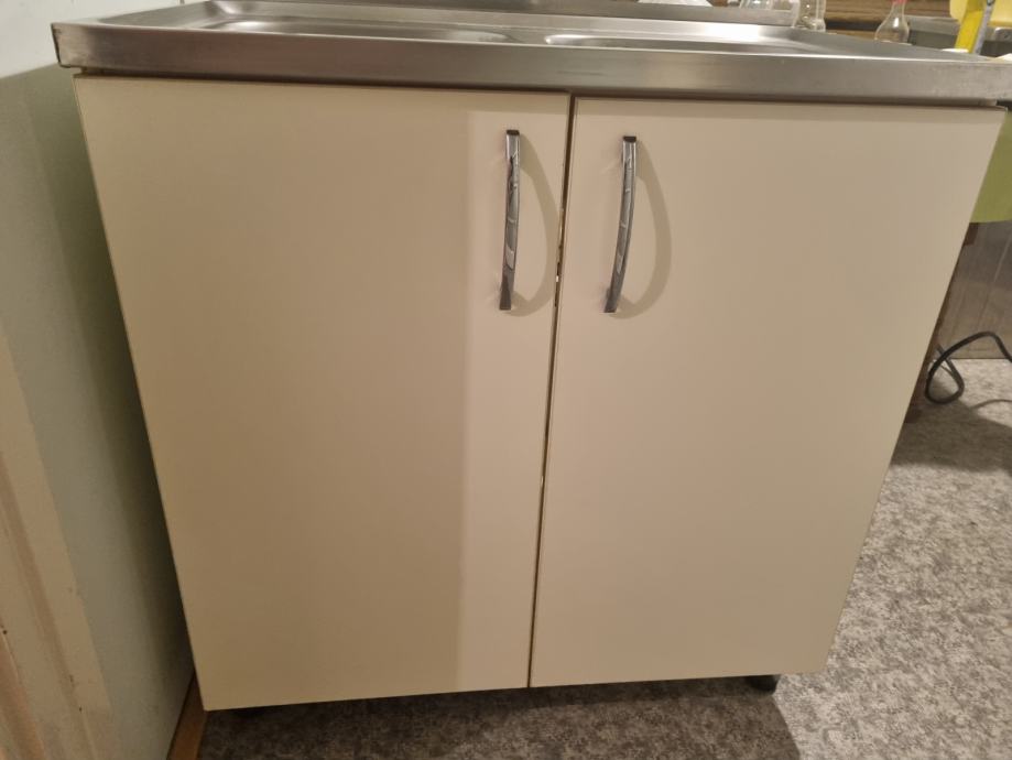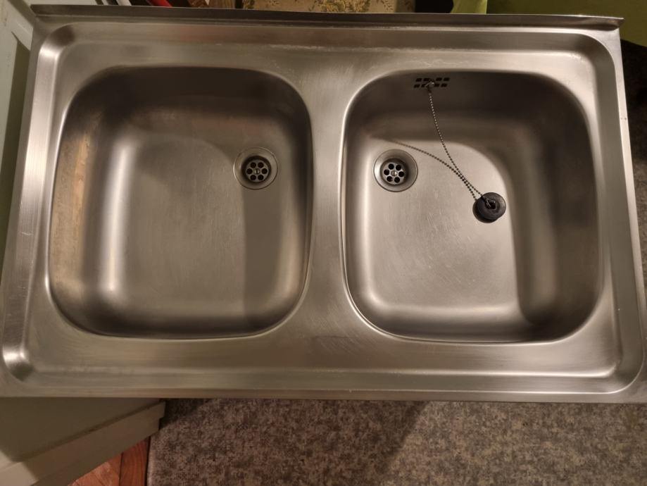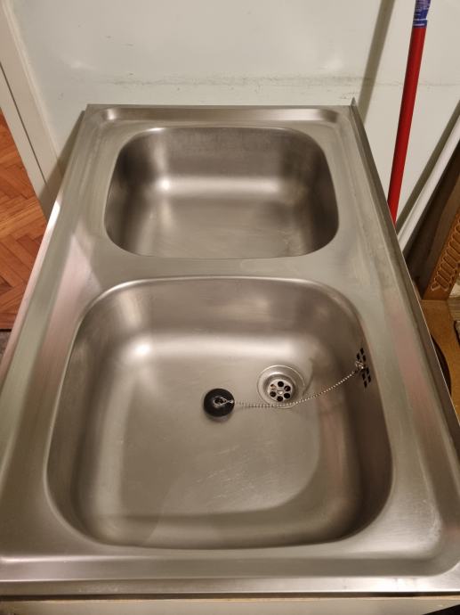 Prodaje se dupli sudoper zajedno s ormarićem i potrebnim cijevima spremnim za instalaciju.