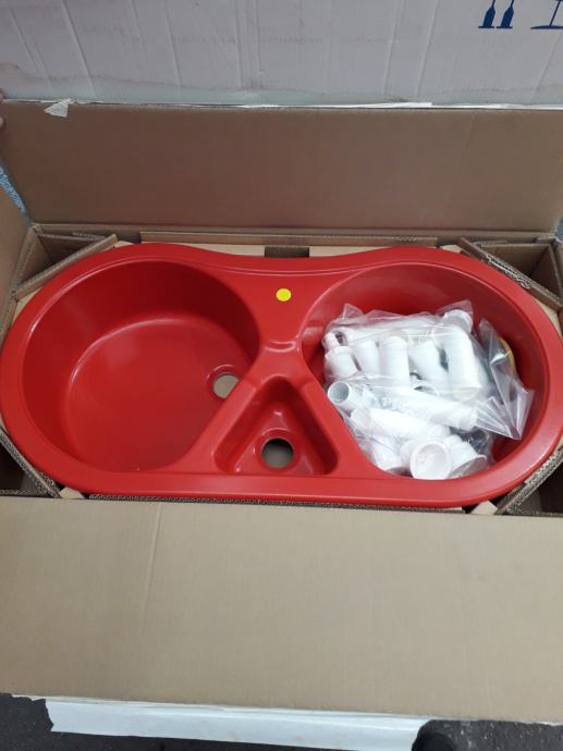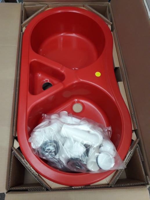 Dvostruki okrugli sudoper od kerrocka novi sa pripadajućim sifonom - crveni