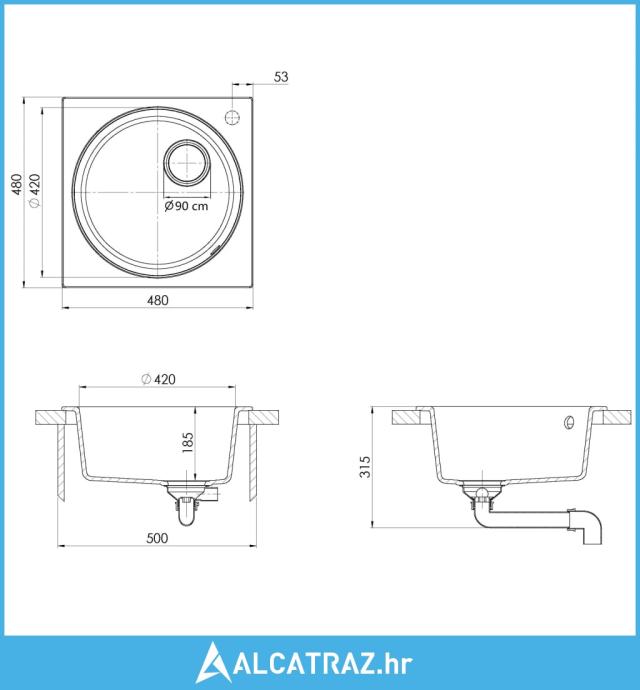 - Promjer otvora za cjedilo: 90 mm