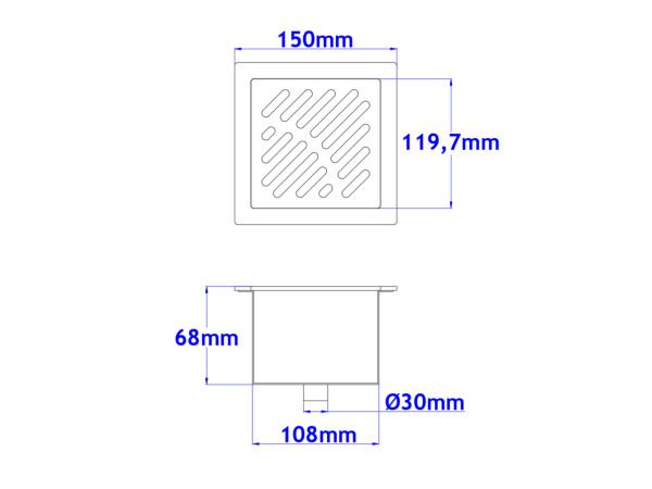 Podni sifon komplet s PERFORIRANIM UZORKOM 150x150x68mm INOKS Ø30mm