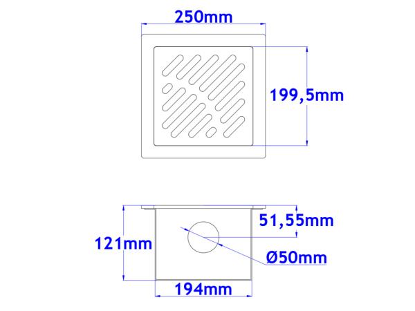 Podni sifon komplet s PERFORIRANIM UZORKOM 250x250x121mm INOKS Ø50mm