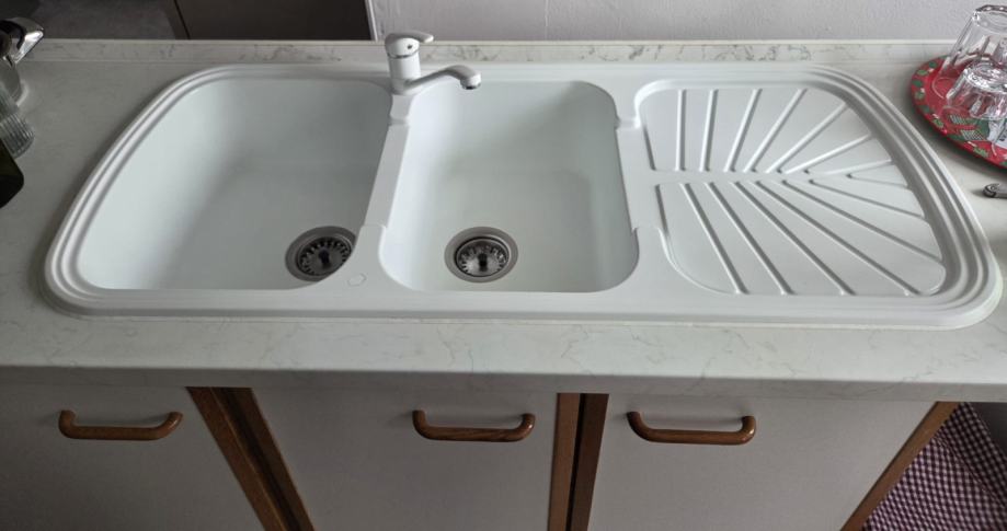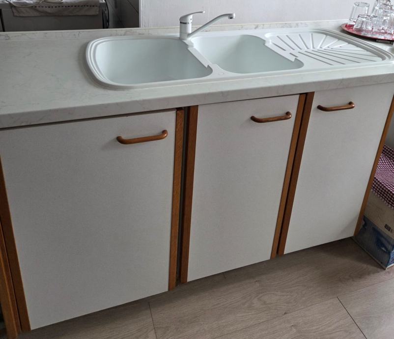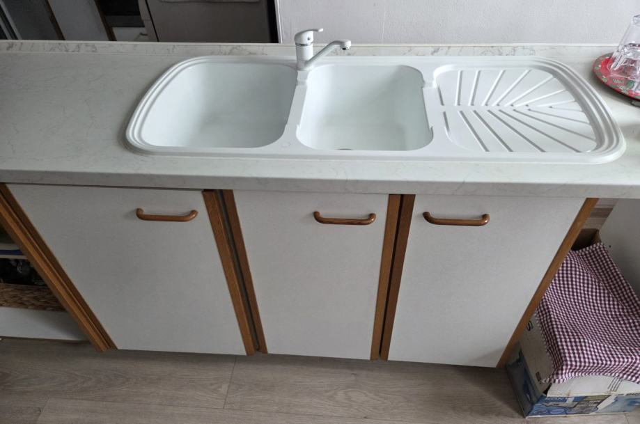 Trodjelni PVC sudoper (Kolpasan) bijeli u odličnom stanju s radnom pločom i dva kuhinjska elementa(80cm+50 cm) i sifonom povoljno prodajem.
