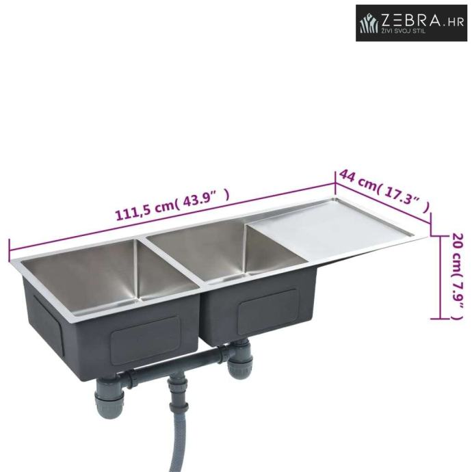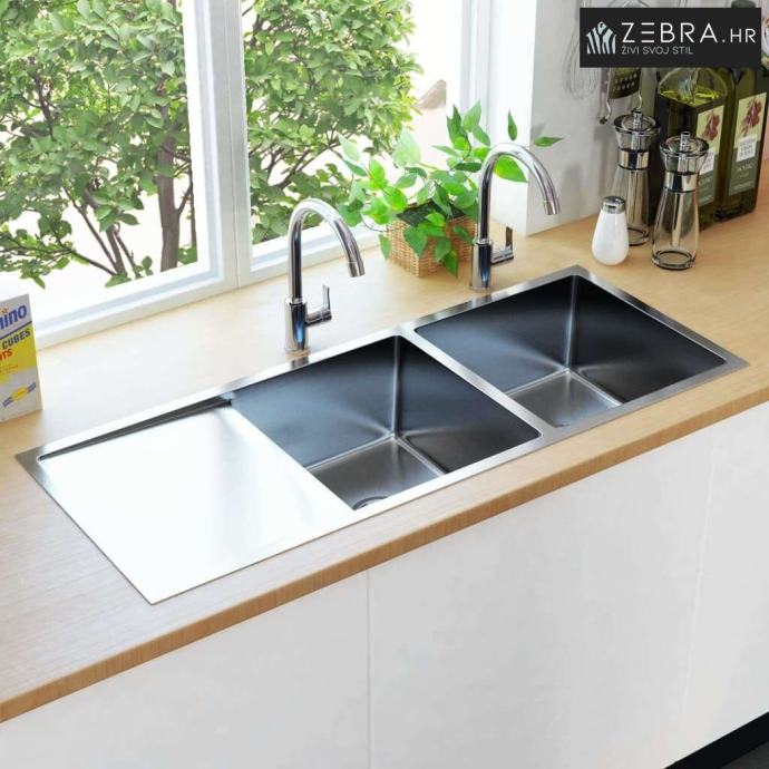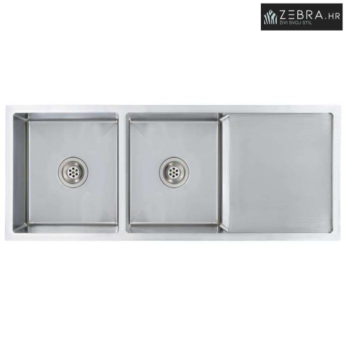 Kombinirajući najbolje u funkcionalnosti i dizajnu, ovaj sudoper s dvostrukom kadicom izrađen je od visokokvalitetnog, ručno rađenog nehrđajućeg čelika u bezolovnoj boji protiv kondenzacije, otpornoj na plijesan i koroziju. Zvučno je izoliran podlogama za smanjenje zvuka. Cjedilo će vam dobro doći pri ručnom pranju posuđa, ali i kao dodatno mjesto za rezanje povrća. Uz to, kadice s jedinstvenim odvodima u obliku slova X pospješuju brzi protok, sprječavajući ostajanje vode na dnu sudopera.