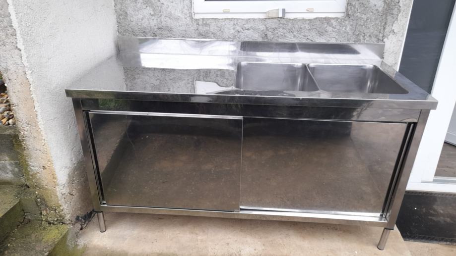 Prodajem korišteni, samostojeći, dupli sudoper, s prostorom za ocjeđivanje i kliznim vratima na elementu ispod, od inoxa, dimenzije:širina 160 cm, visina 90 cm, dubine 70 cm.