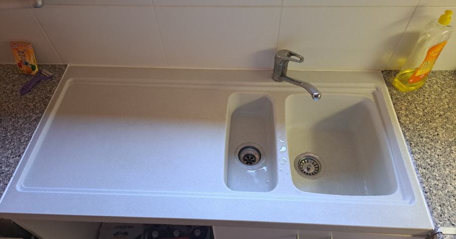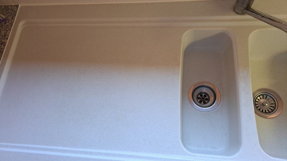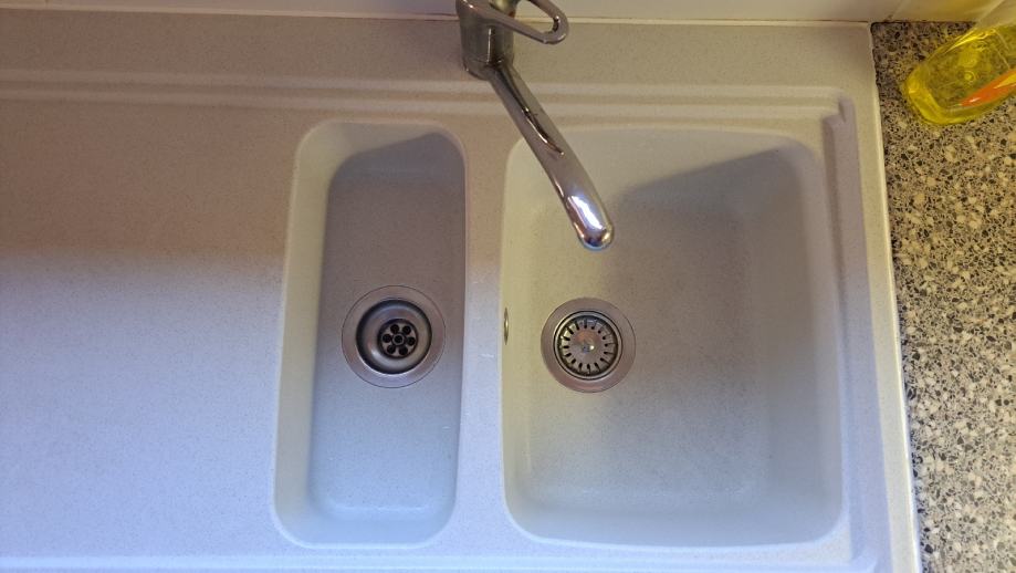 Prodajem kompozitni sudoper bijele boje s dvije kadice različitih veličina i odlagalnom površinom s lijeve strane.