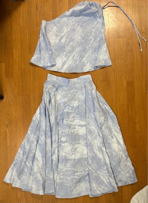 Suknja je nova bez etikete. Dužina suknje od struka je 85cm, a širina struka je 35cm. Top je dužine 40cm, može se podesiti vezicama