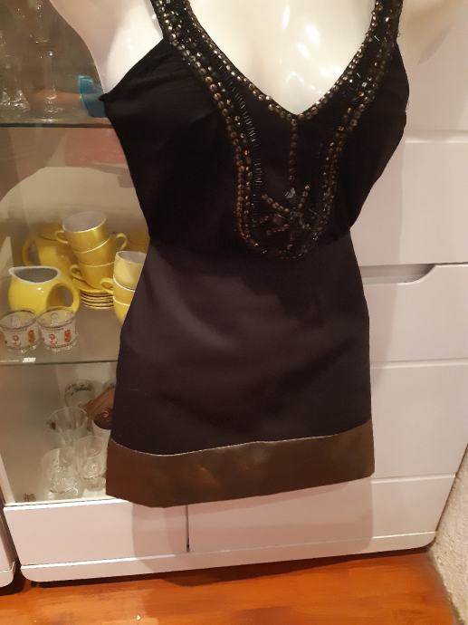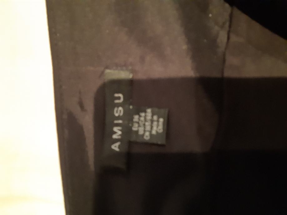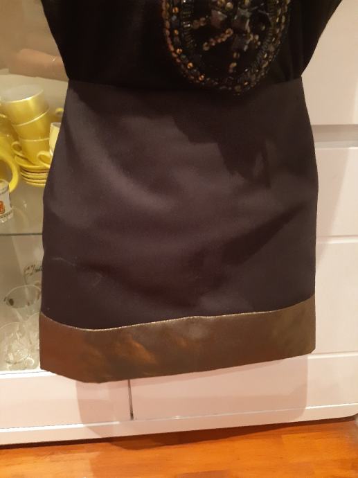 AMISU crna uska suknja sa zlatnim doljnjim dijelom, mini. Vel. 36. Širina struka, prednja strana: 36 cm, duzina: 37 cm. Sastav: 50% pamuk, 47% poliester, 3% elastin.