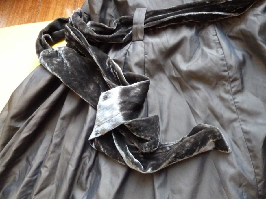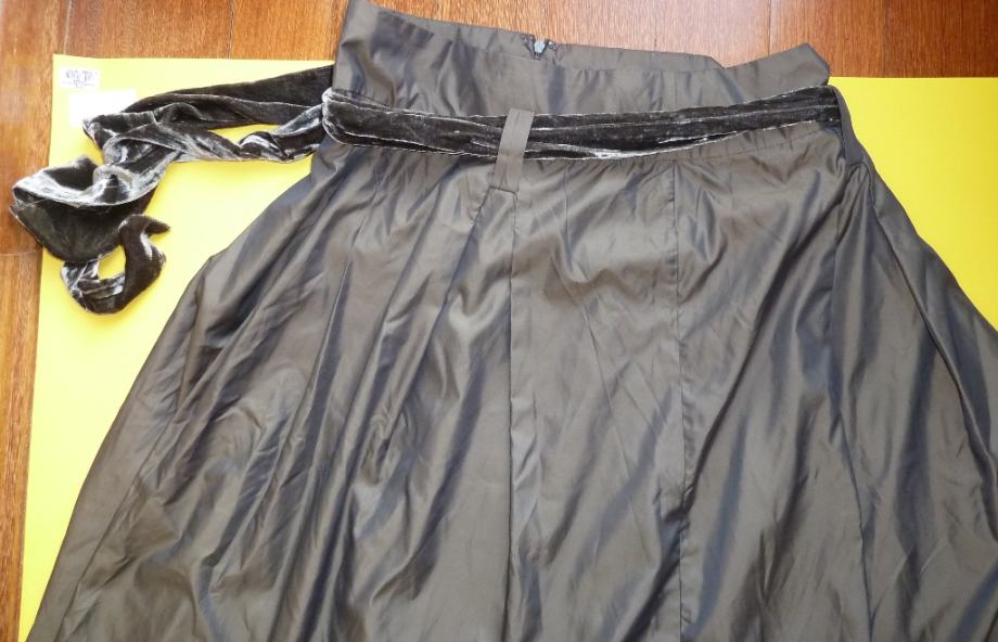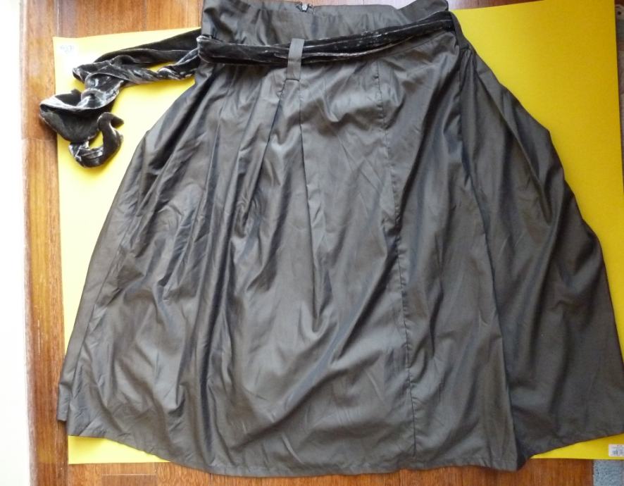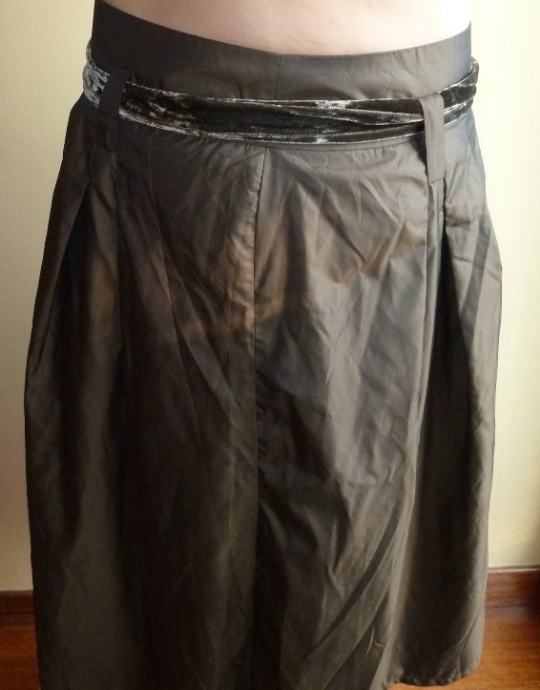 Suknja veličine broj 42 (možda čak i dobra za 44), meni je velika što mi je jako žao, kupljena ovdje, ali mora dalje. Ima plišani remen za struk. Dužine je do ispod koljena (ja sam visoka 173 cm). Materijal fino pada, šuškavi je. Nema apsolutno nikakvih nedostataka na njoj, osim što je nisam popeglala prije fotografiranja :)