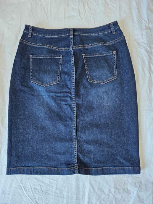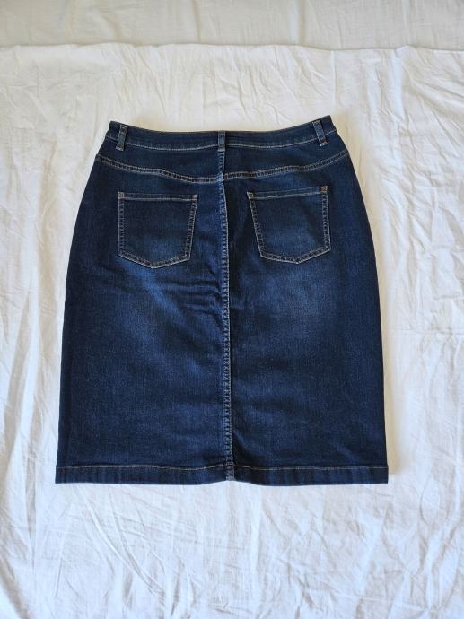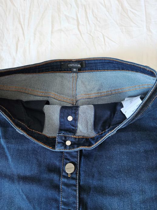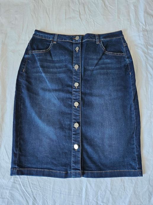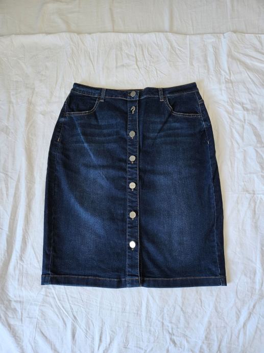 Prekrasna jeans tamnoplava suknja marke Comma. Uska, strukirana, dužine do koljena, otvara se po sredini na dugmad. Veličina 38 (M). Dimenzije: širina u struku: 38 cm, u bokovima: 46 cm, malo se rasteže pa se može nadodati u širinu 1 - 2 cm, dužina: 55 cm. Malo nošena, odlično očuvana.