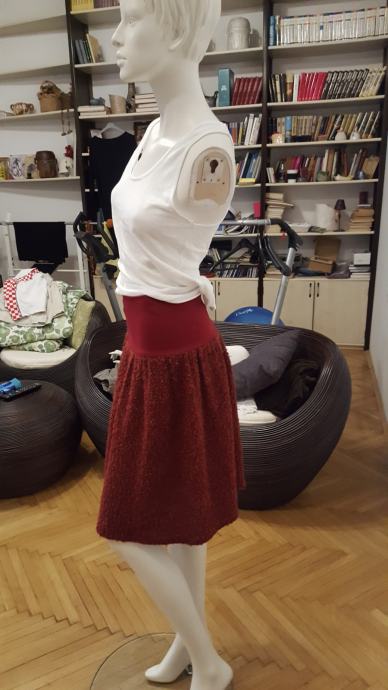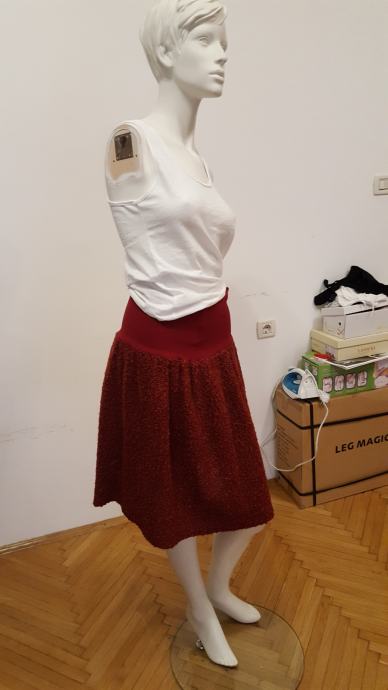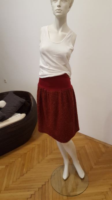 Simpatična nepodstavljena suknja od buklea (40% vuna, 60% poliakril), veličina 40. U struku široka elastična pasica (14 cm) . Duljina suknje 60 cm. Širina u struku 34 cm, rastezljivo! Može se nositi i na boku. Suknja je kupljena u jednom lokalnom boutiqueu. Nošena vrlo malo, svega nekoliko puta, u izvrsnom stanju. Cijena 13€ + trošak dostave.