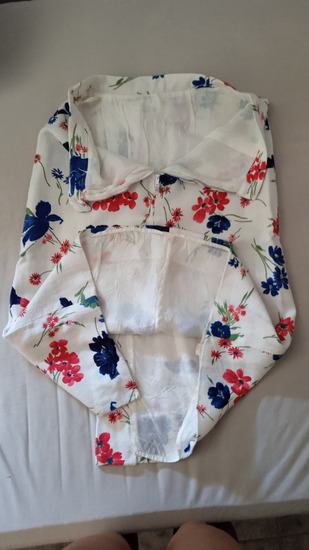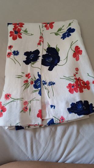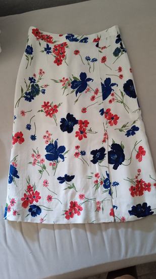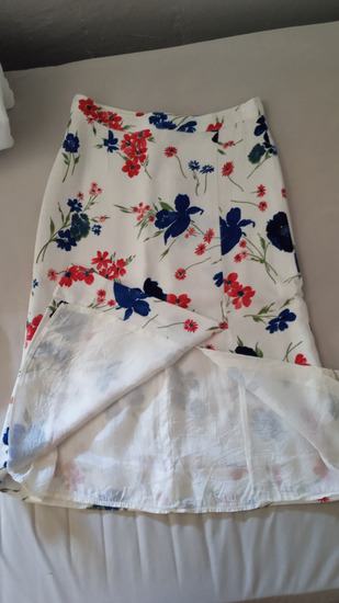 Cvjetna suknja s prorezom, straga ima rajfešlus i dugme, postavljena, jako udobna, ne gužva se, pamučna, super pada. Vrlo malo nošena, očuvana. Veličina 36.