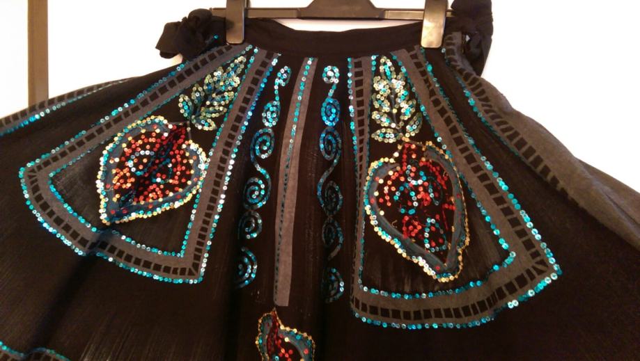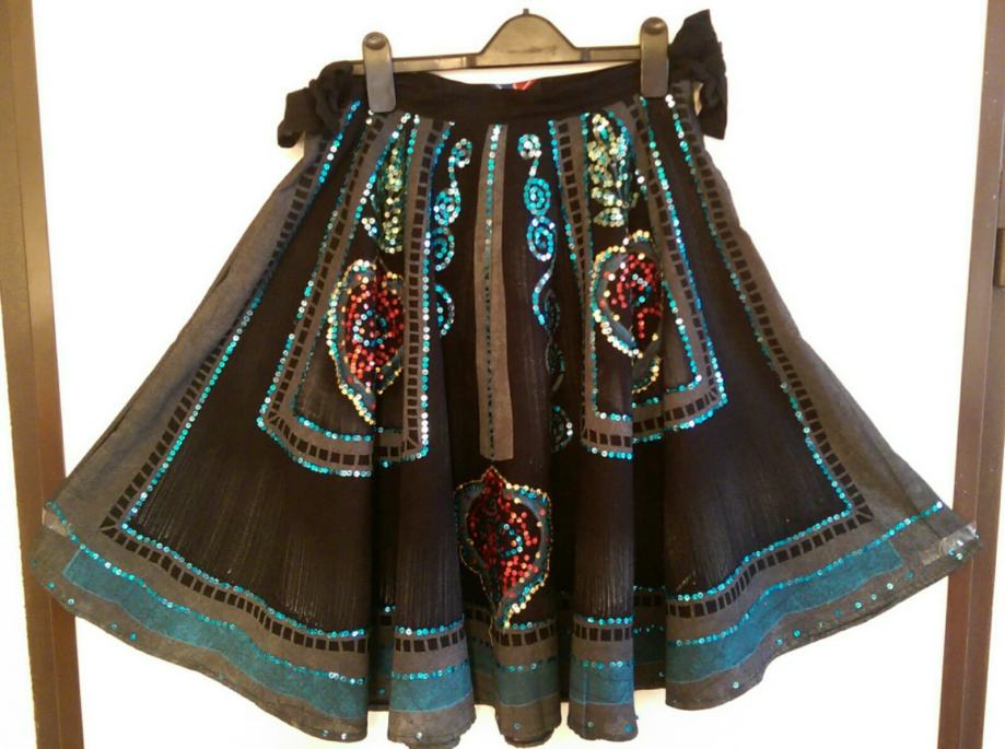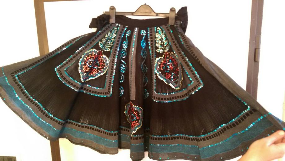 E-Play (prva linija Replay-a) suknja crna,malo grublje platno,A kroja izvezena šarenim šljokicama,vezanje i cif sa strane,posebnog izgleda...vrlo atraktivna i exclusivna!