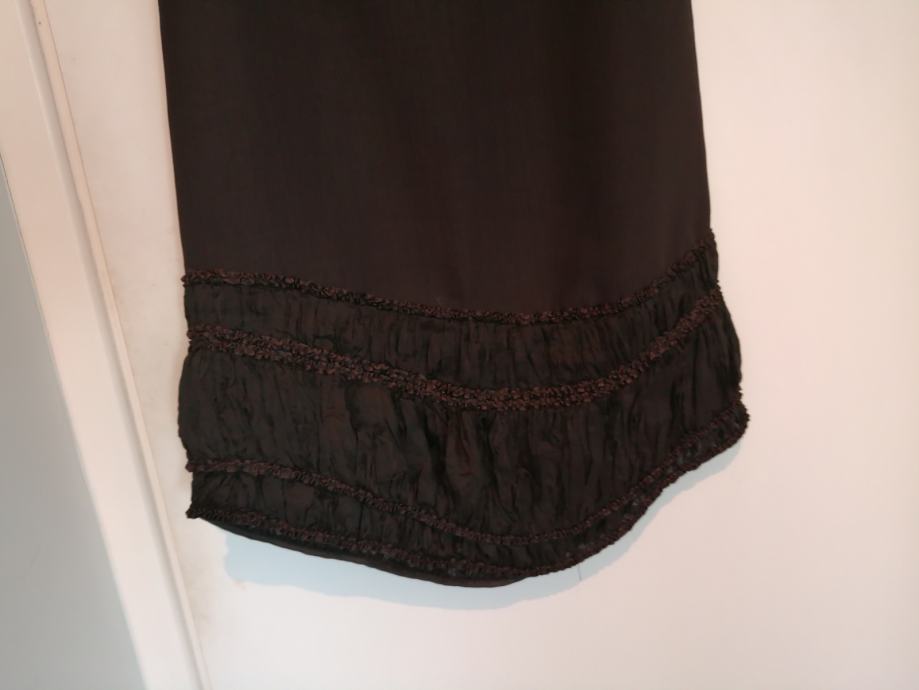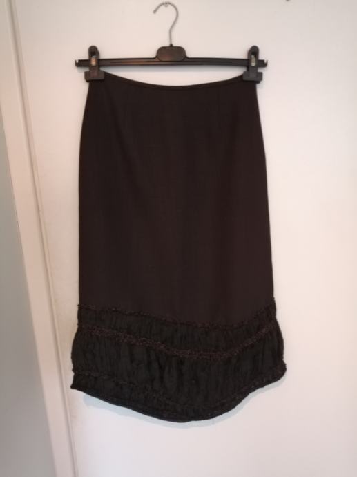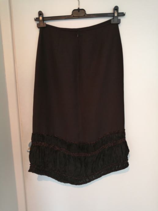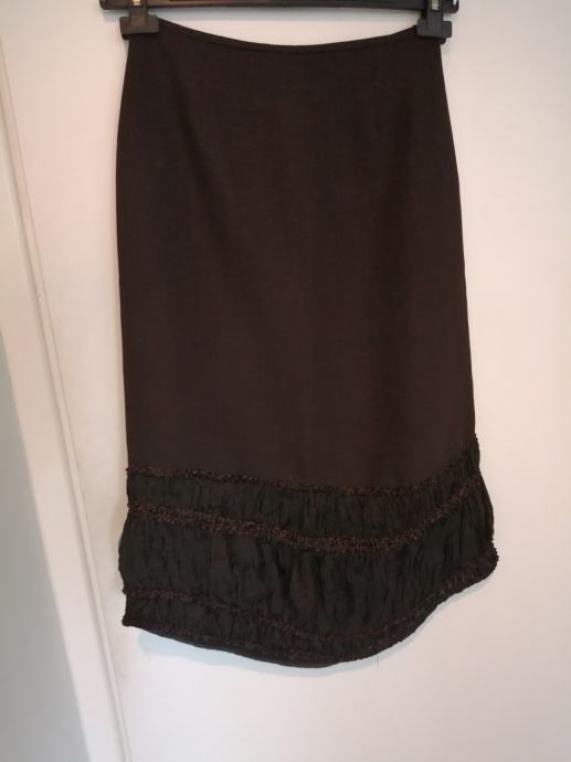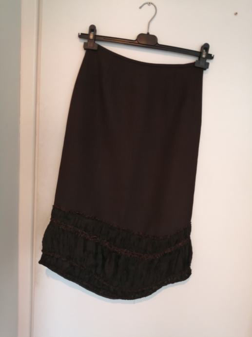 Prelijepa smeđa poslovna suknja. Kao nova je. NA dnu ima zanimljiv dio. Poseban materijal. Ugodna za nošenje. Profinjena i elegantna. Konfekcijski broj 36/38.