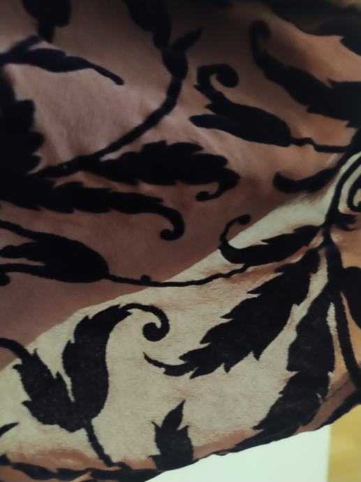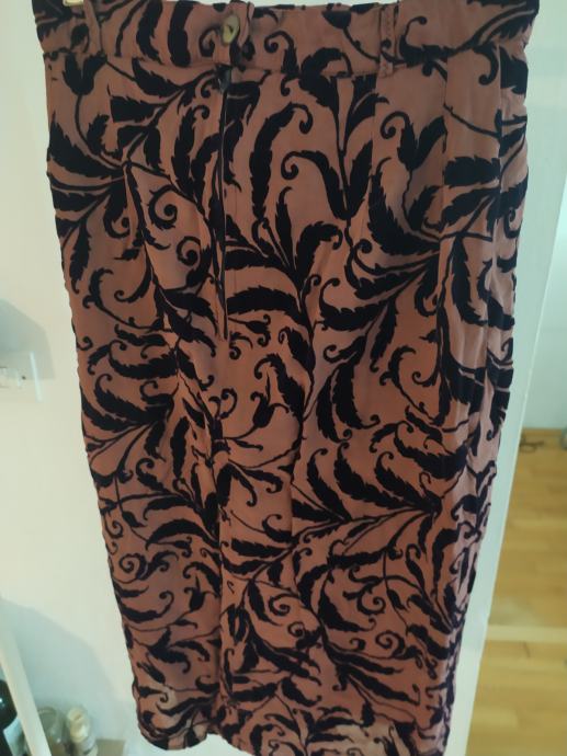 Elegantna suknja od prozirnog pamučnog muslina sa samtastim aplikacijama, podstavljena, bordo-ljubičaste boje, midi dužine, uska sa faldom, šivana po mjeri, vel. 36, nošena, u vrlo dobrom stanju.