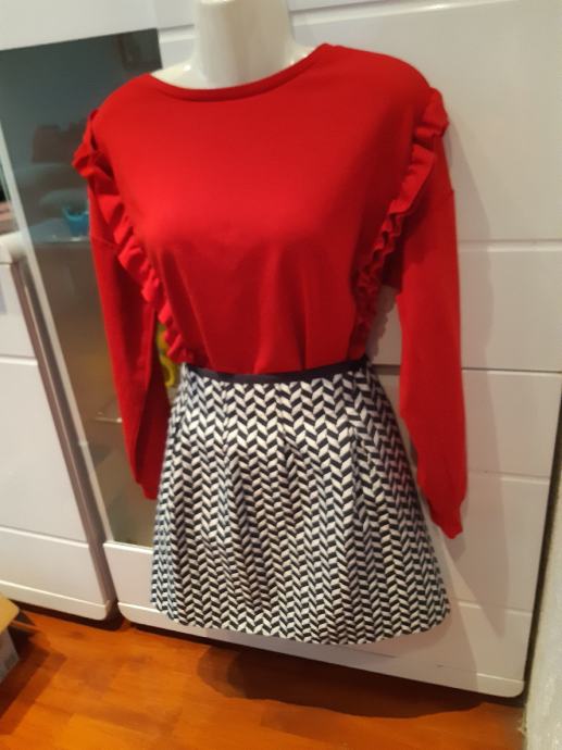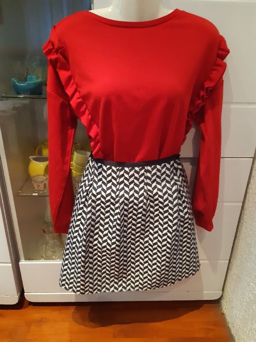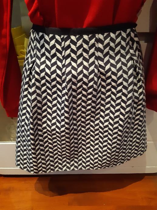 ESPRIT crno- bijela reljefna suknja A l8nije, print kao riblja kost. Vel. 40. Širina struka, prednja strana: 43cm, dužina: 46 cm. Suknja je naprijed lagano nabrana, s faltama.