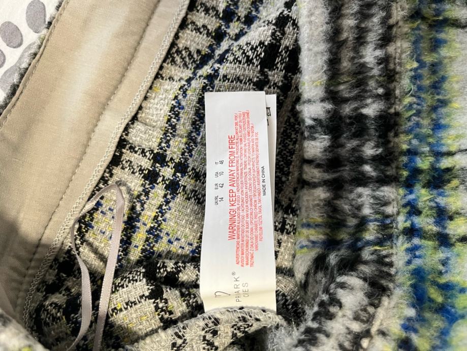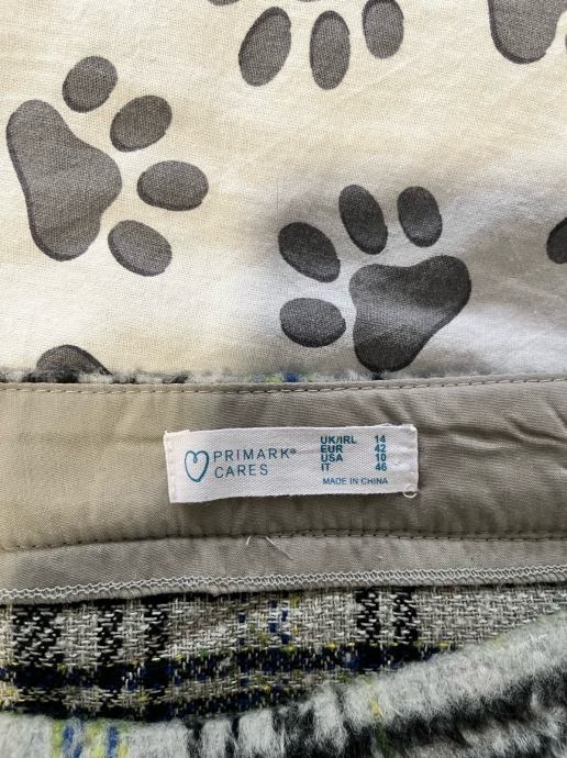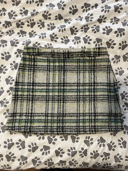 Karirana zimska suknja sive boje, savršena za hladnije dane. Veličina 42, elegantna dužina ispod koljena. Udoban komad za upotpunjavanje zimske garderobe.
