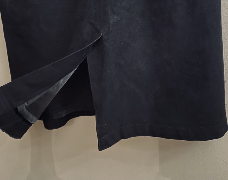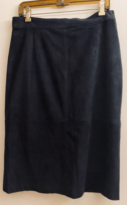 Brušena koža Ispod koljena, ravni kroj, ženska suknja, podstavljena. Struk je oko 85 cm, sa ziperom iza i gumbom. Ima i šlic iza.