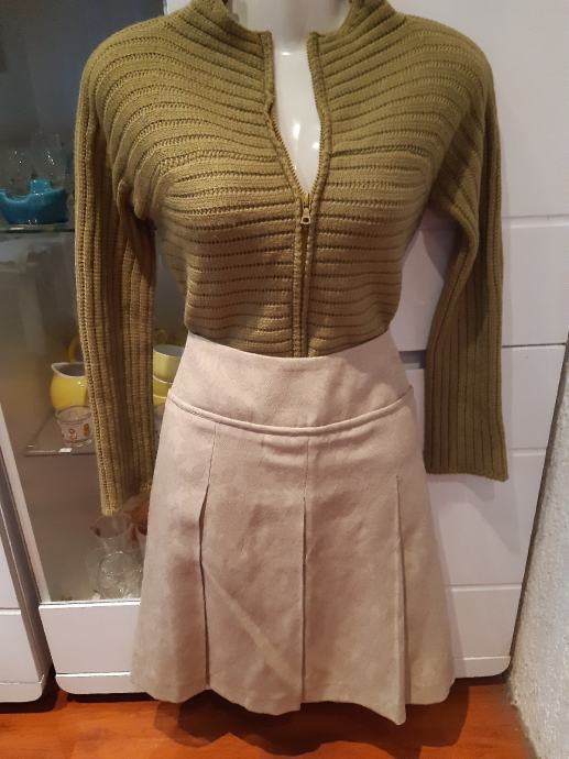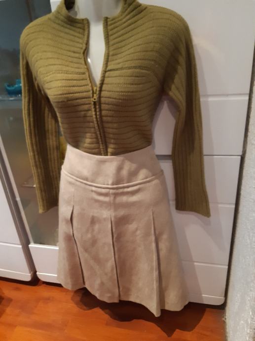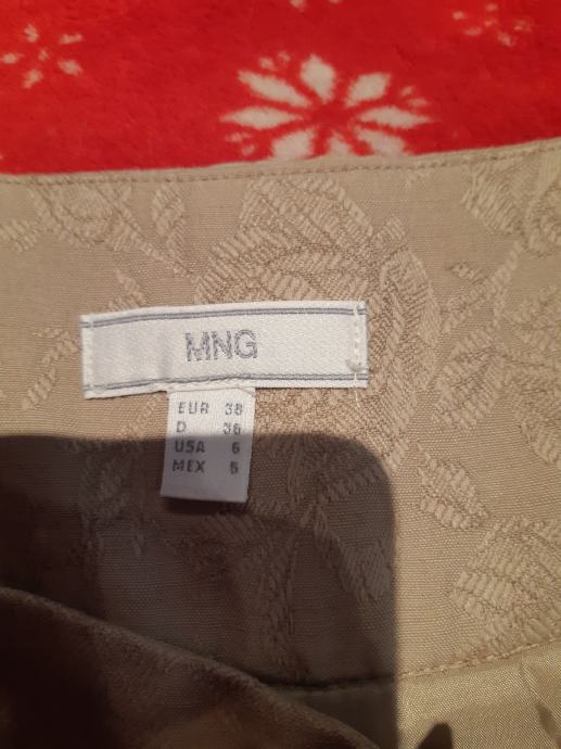 MANGO bež suknja s faldama, reljefni uzorak, vel. 36. Sirina struka, prednja strana: 40 cm, dužina,: 57 cm. Dastav: 45% poliester, 40% viskoza, 15% lan
