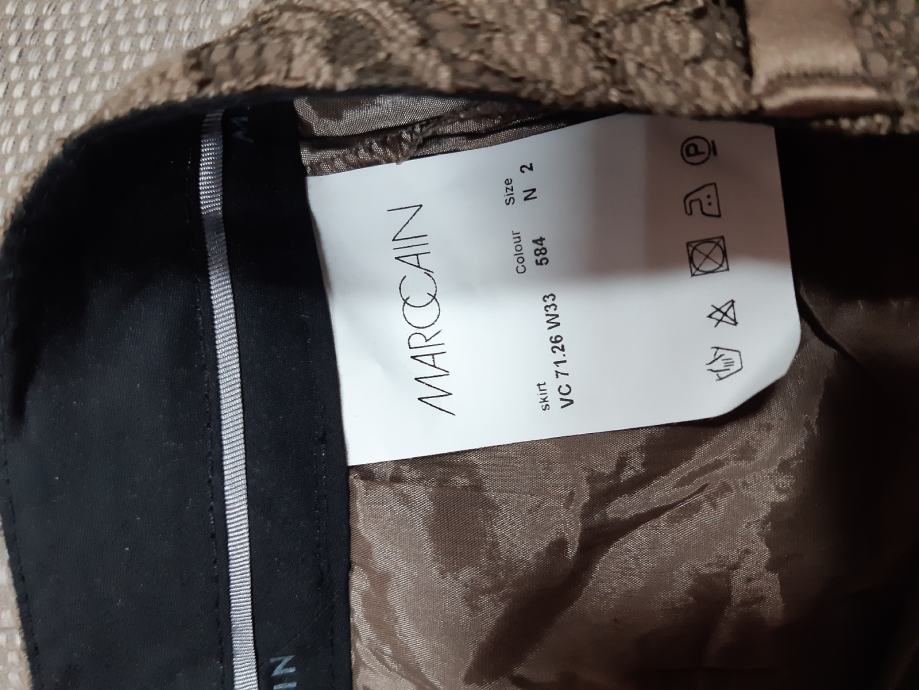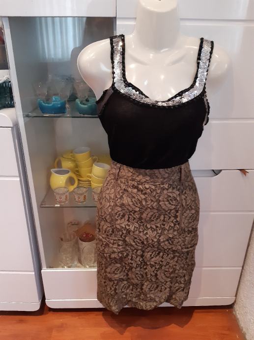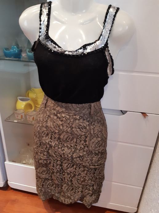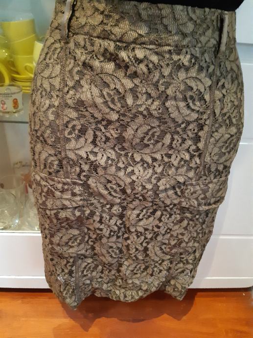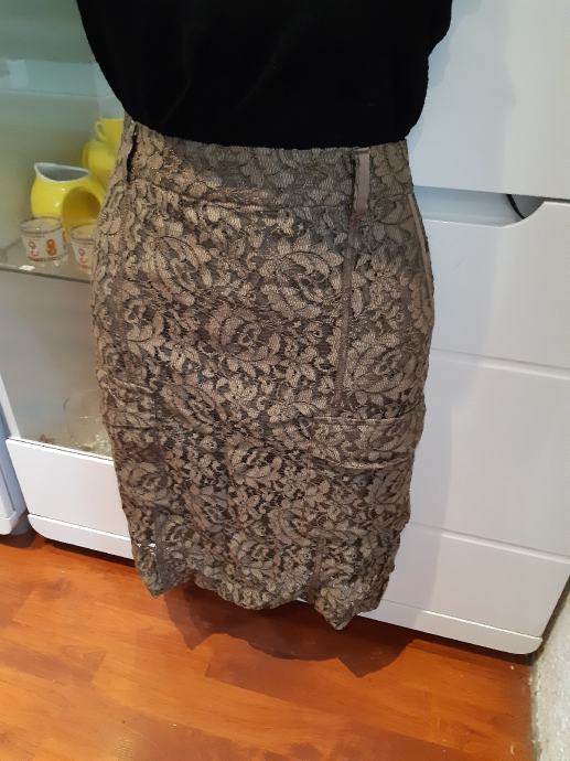 MARC CAINnova smeda cipkasta podstavljena uska suknja, vel. 36. Sirina struka, prednja strana: 36 cm, bokova: 44cm, duzina: 56 cm. Sastav: 90% viskoza, 10% mikrofibra.