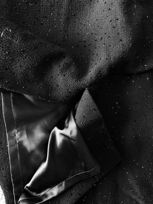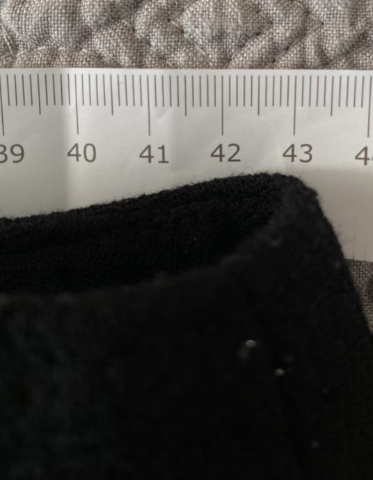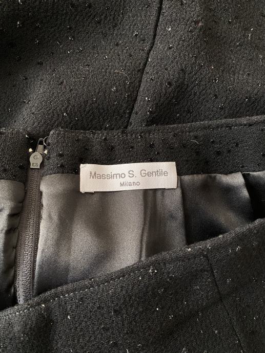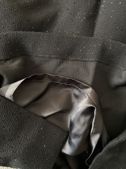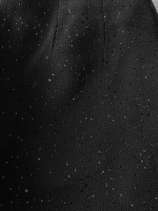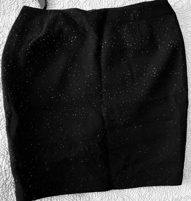 Channel- ish izgled materijala i kroj…Dizajnerska, svečana i dnevna fina suknja, podstavljena, mekana- vuna i pamuk je materijal, s odsjajem poneke crne šljokice koje reflektiraju svjetlo je talijanska dizajnerska grupa prekrasno namijenila za dnevno i svečano nošenje.( tako su i reklamirali … za poslovnu ženu koja zna što treba u uredu, na putu, navečer). Mjere: struk je oko 86cm, duljina je oko 54-55 cm.