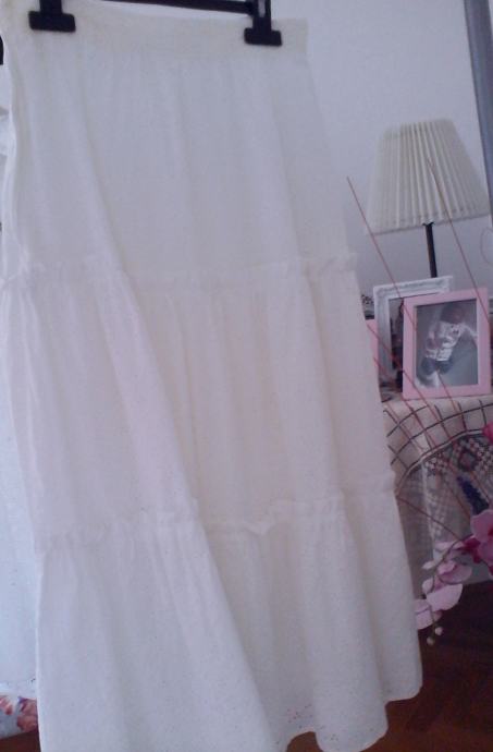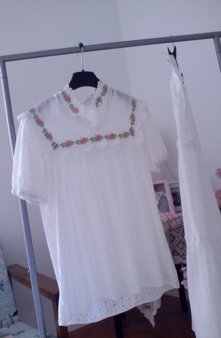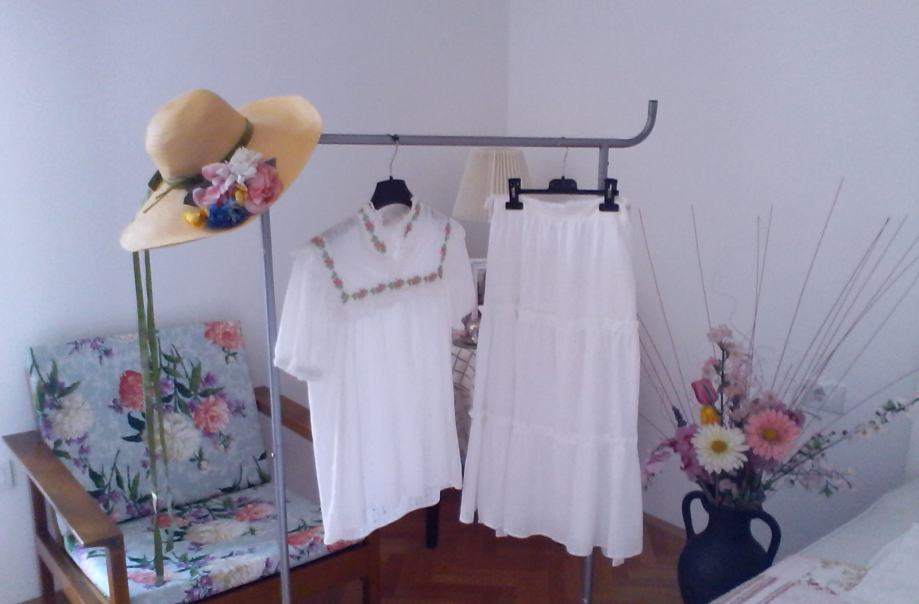 Komplet, bijela bluza i bijela suknja velicine midium. Cisti pamuk. Bluza je ukrasena njeznim raznobojnim cvjeticima i volancicem. Suknja je malo ispod koljena, ima svilenu podstavu i na dnu je ukrasena volanom komplet odise romantikom bio je moja vjencanica uz koju je idealno pristajao siroki mekani sesir ukrasen barsunastom zelenom trakom i struckom raznobojnog umjetnog cvijeca cijena kompleta 150kn cijena sesira 50 kn idealna kombinacija za pricest krizmu vjencanje ili bilo kakvu drugu svecanu prigodu kada zelite biti drugaciji