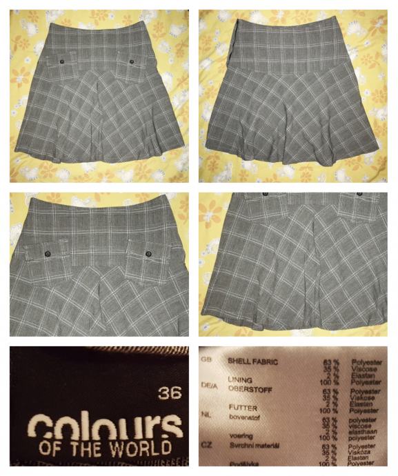 Siva, karirana, a džepićima na gumbiće sprijeda, bez proreza. Podstavljena. Viskoza 35% sastava. Cif na boku.