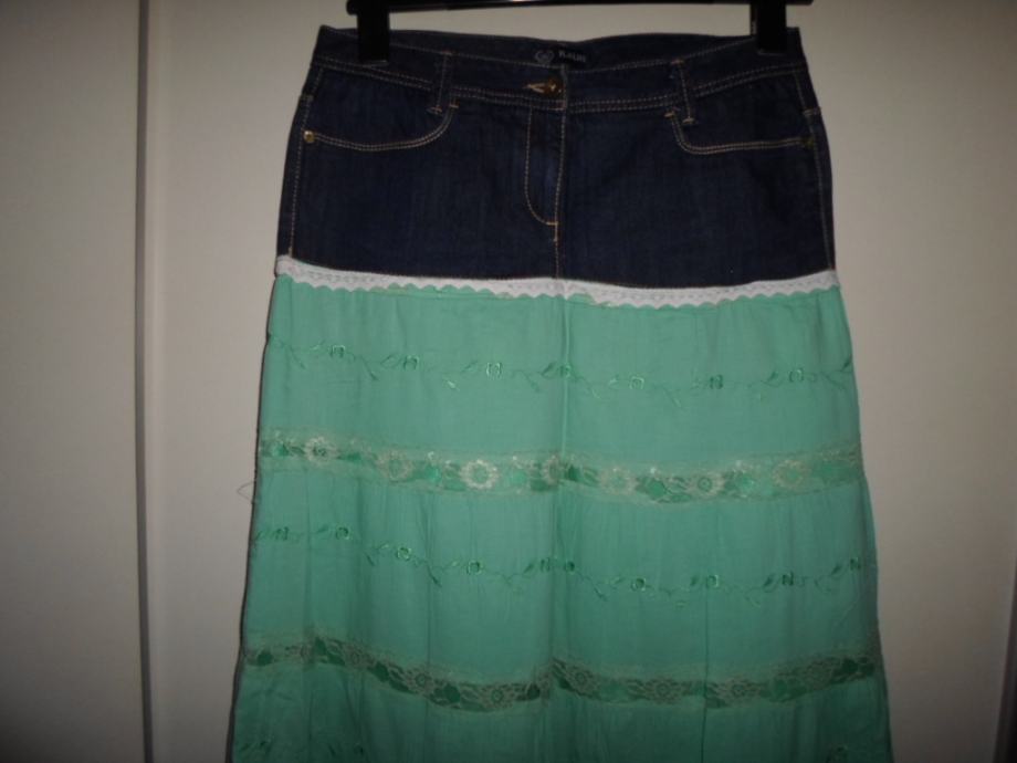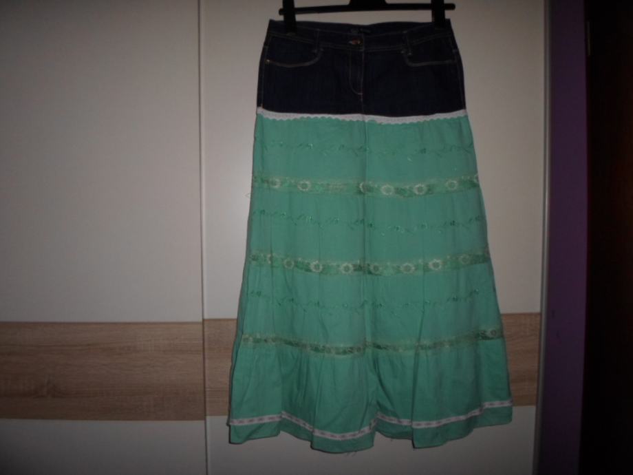 Playlife maxi suknja, gornji dio od trapera a donji pamučno platno lijepe tirkizne boje.