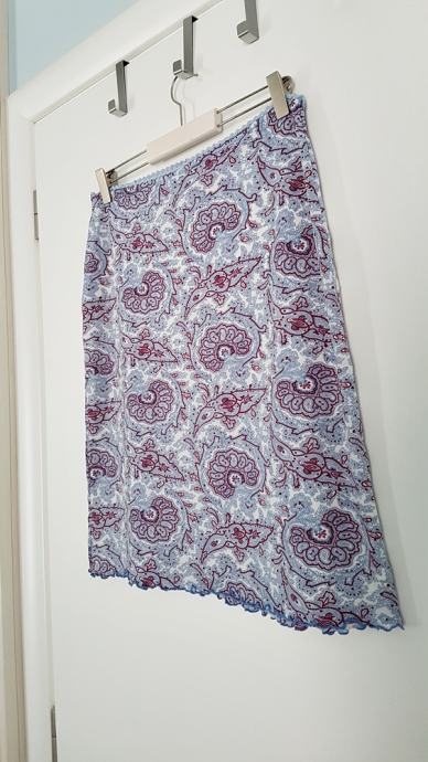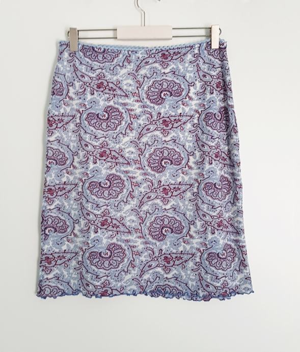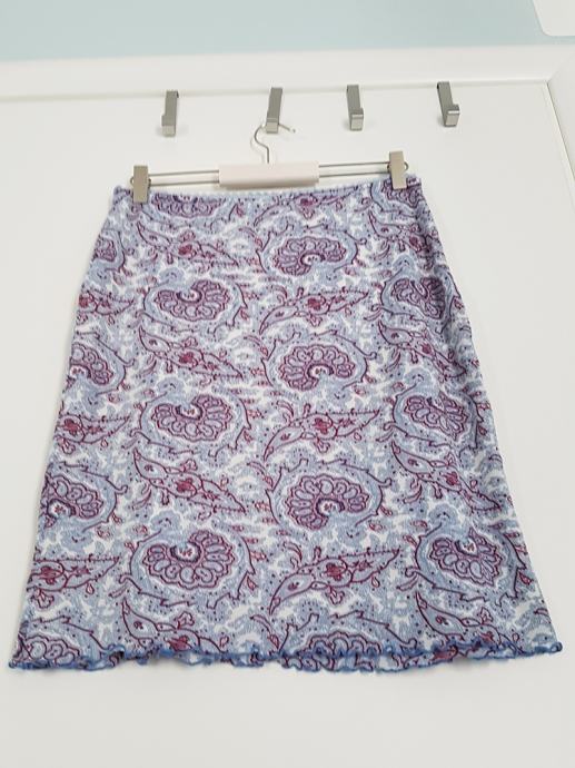 Suknja je elasticna no nema unutarnje etikete sa sastavom. Lijepo prati liniju tijela, ugodna je mekana. Ima 2 sloja, bijeli kao podstavu i sareni.