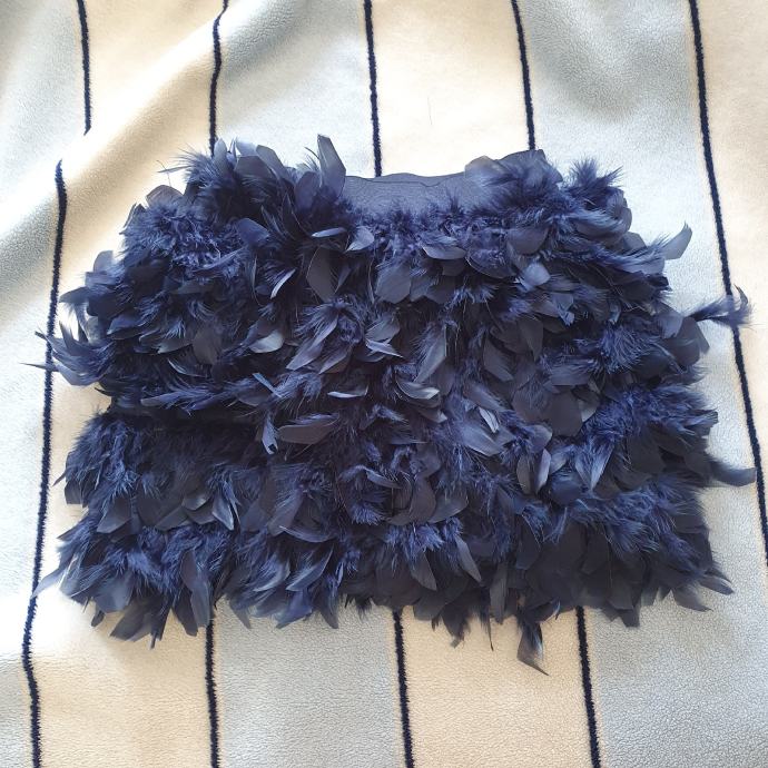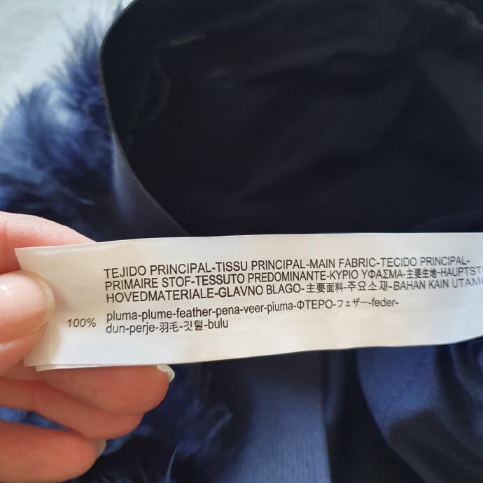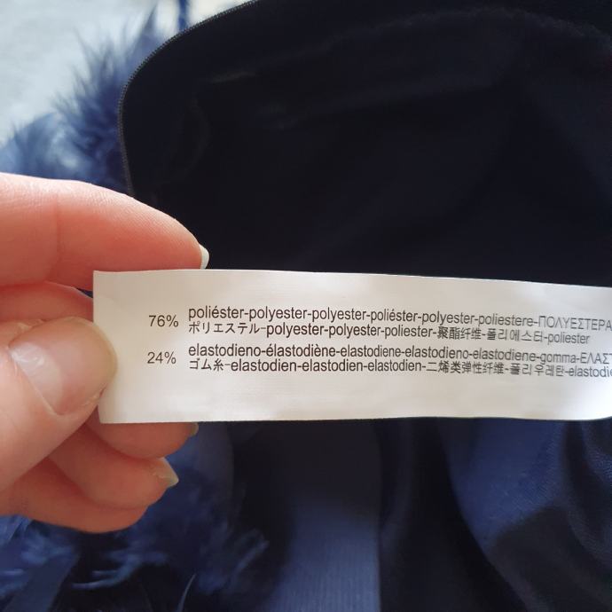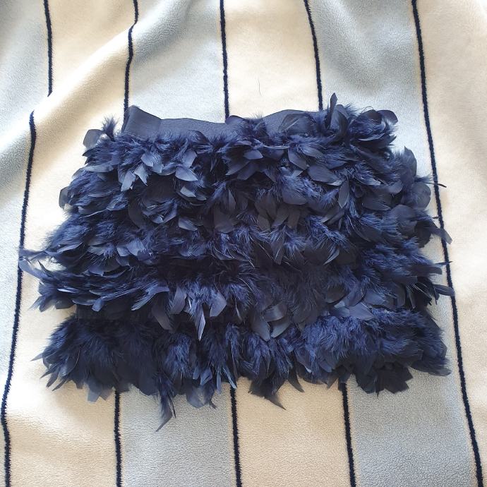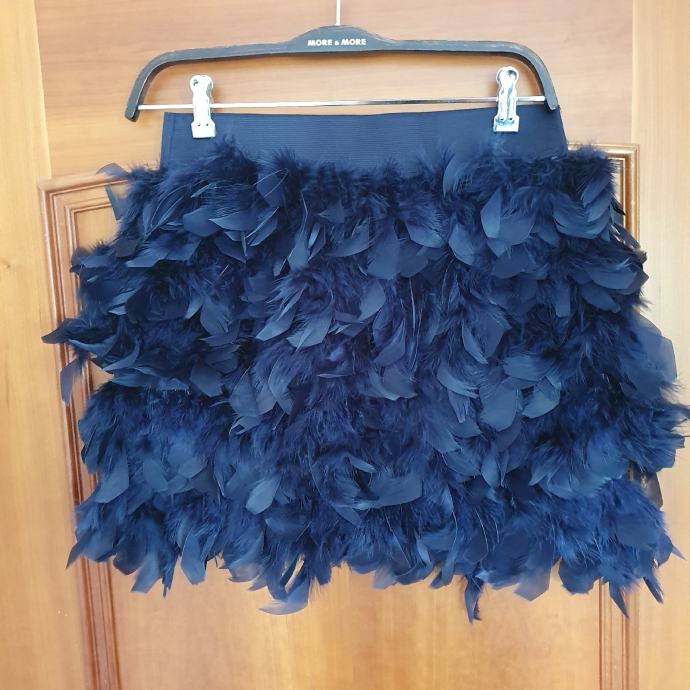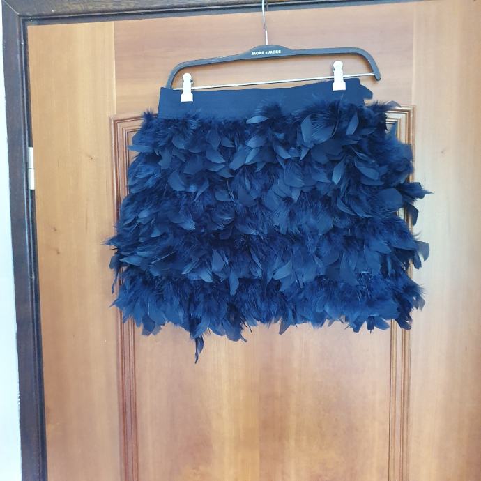 Stradivarius prekrasna plava suknja veličina S. Bogata je perjem i prekrasno izgleda, nažalost udebljala sam se i ne mogu je više obući. Zaista izgleda odlično kad se obuče. Struk 35cm i još se rasteže jer je guma, dužina 40cm. 100% perje izvana, 76% poliester, 24% elastin. Cijena sa slanjem 17 eura, osobno preuzimanje 15 eura.