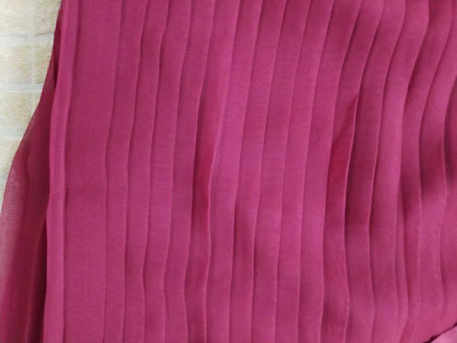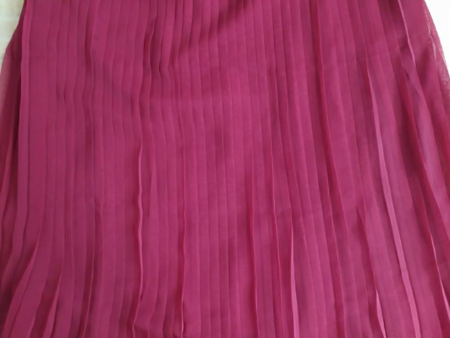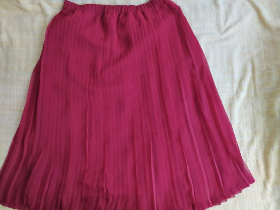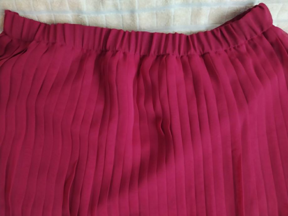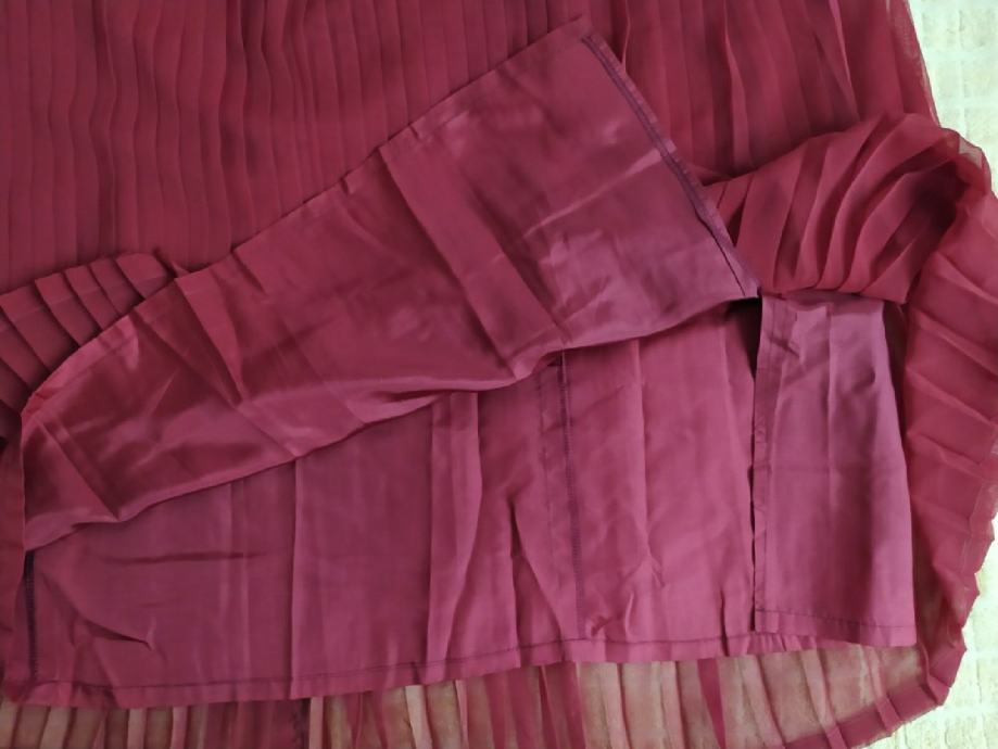 Suknja plisirana "PIK" vel 44 nova. Bordo crvena boja. Materijal 100% polyester. Jako fina prozračna tkanina materijal. Potpuno nova nkada nošena. Struk 43cm, dužina 80cm, širina pri dnu cca 85cm.