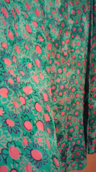 Materijal je s cvjetnim uzorkom (crveni detalji), i još dodatno se vidi površinski uzorak u tkanju (kao kod damasta), vidljivo na svjetlu.