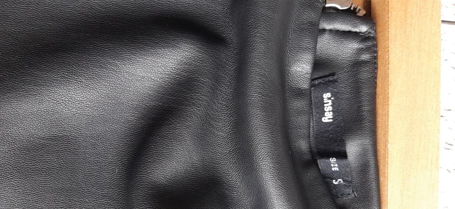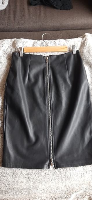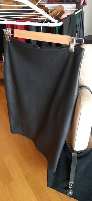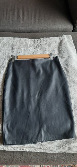 Suknja od umjetne koze, crna S/M. Mislim da moze i velicina M za vitkiju osobu. Struk 36 cm, prednja strana, bokovi 44 cm. Duljina ispod koljena. Pencil kroj. Na straznjoj strani patent koji se moze otvarati s obje strane. Marka Sinsay. Slanje na trosak kupca.